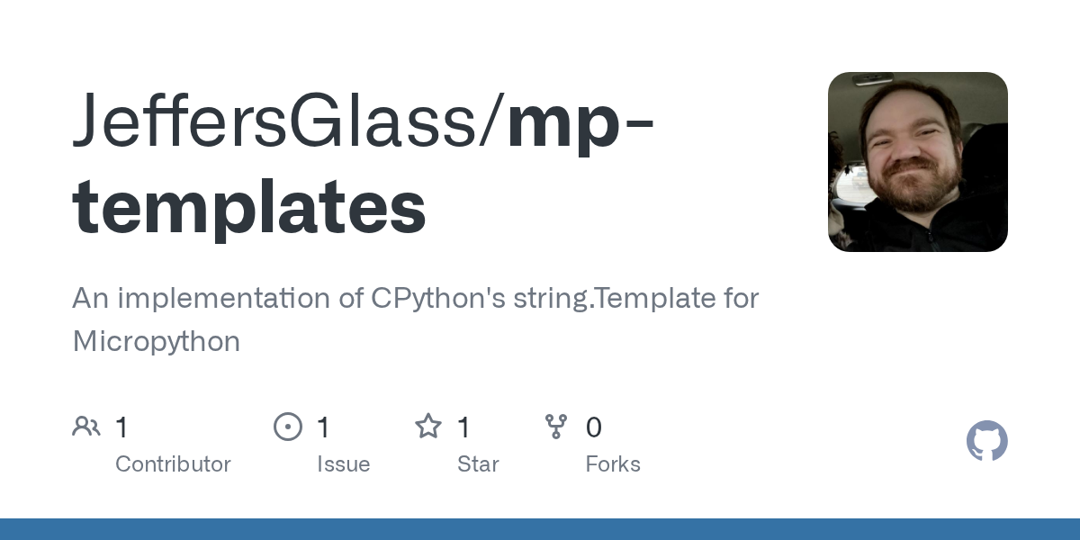 from string import Template throws in MicroPython ... please add this to the list of questions whenever you have some time .. you really missed out on today demos and no, nobody recorded, Hood was in the house too Template https://github.com/JeffersGlass/mp-templates (edited)Template class your demo got today Andrea