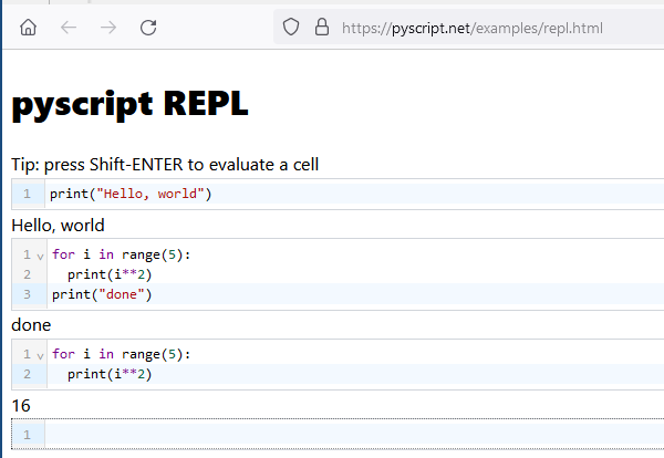 it's been already published to npm so it's possible to try it already. This version fixes lazy terminal (or runtime) initialization and allows MicroPython too.worker attribute to work properly, as the input is mandatory/needed in here, you need to enable COOP and headers to allow SharedArrayBuffer. npx mini-coi ./ would do ... save that code as index.html in any folder you like, go into that folder and run that command ... you should be in a REPL like this one: