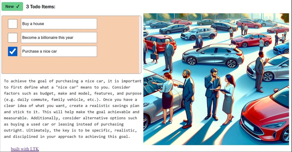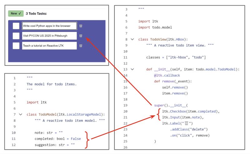 ltk.Model and enabled ltk.Text and ltk.Input as the first two View widgets that can be connected to a model. See the example in the KitchenSink called "MVC": https://pyscript.github.io/ltk/?tab=14