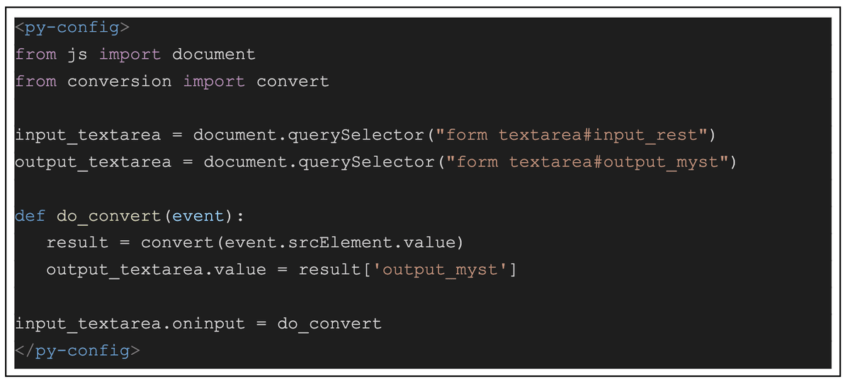 main.py you will find the usage of the Hiccup syntax. Hiccup is about representing HTML in Python. Using list or tuple to represent HTML elements, and dict to represent the element attributes.