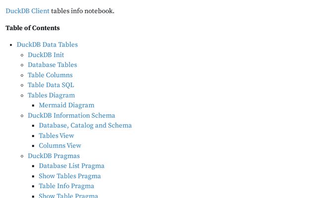 duckdb can already be compiled to WASM, I am just trying to build it for pyodide. There's an open PR on the pyodide repository for this. I have tried it and was able to build 0.4.0 locally but wasn't able to build 0.6.0. The next step for me is basically contacting pyodide folks about this and hopefully collaborating on this and pushing it forward. .csv, .json, or .parquet data files to preview. See DuckDB Client notebook for more info. Database Tables Table Columns Select table: Table Summary Summary of table data using Summary Table Observable cell: Table Data Data Wrangler Query...